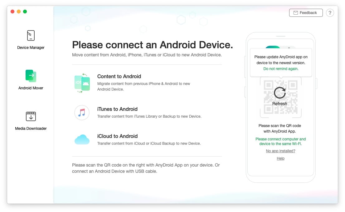 Hiện tại AnyDroid đã được bổ sung thêm một vài tính năng hữu dụng khác bao gồm Android Mover: chuyển file từ iPhone hoặc Android sang một thiết bị Android mới, chuyển nhạc từ iTunes sang Android, chuyển file iCloud sang thiết bị Android và nhiều nhiều những công dụng khác với Android Mover này.