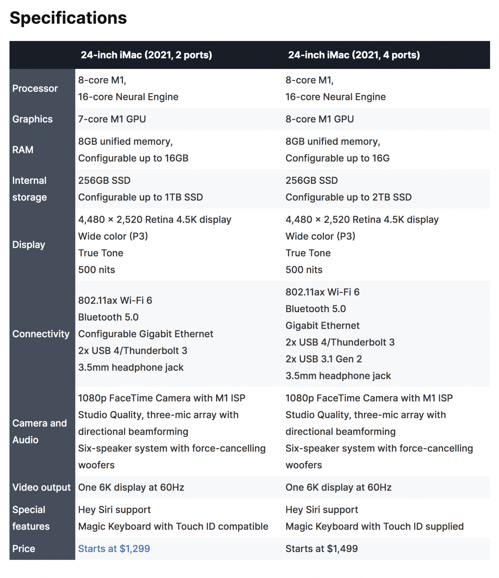Dưới đây là cấu hình 2 phiên bản iMac M1 24 inch đang được bán ra bới Apple Silicon