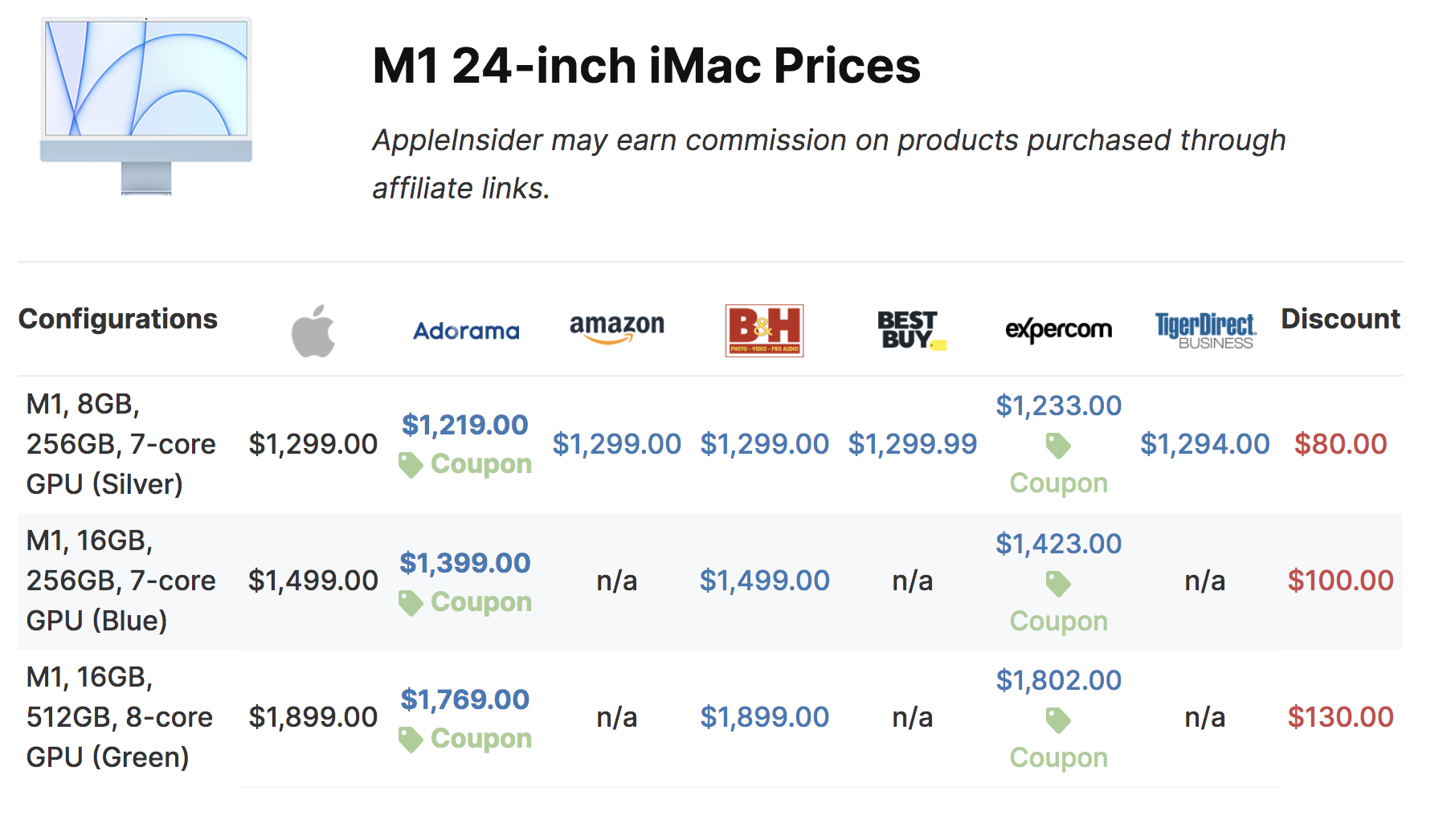 Các bạn tham khảo giá iMac M1 24 inch trên các trang mạng điện tử , giá này thì áp dụng tại mỹ , singapo, hong kong, hi vọng 1 ngày nào đó những thiết bị mới của apple được bán chính thức như thế tại viêt nam ! mặc dù nhiều trung tâm cửa hàng đại diện uỷ quyền nhưng giá tại việt nam khá cao so với hãng !