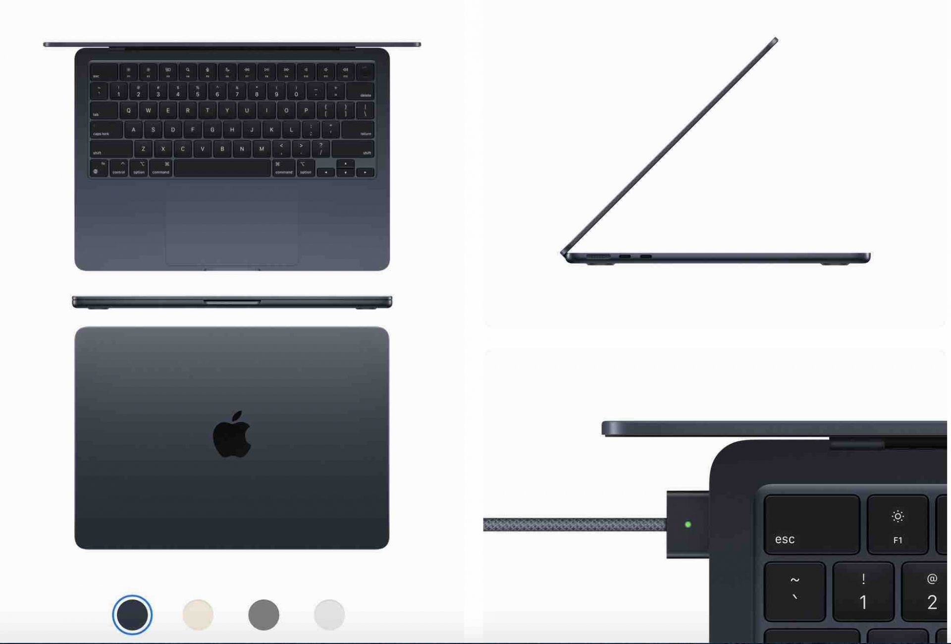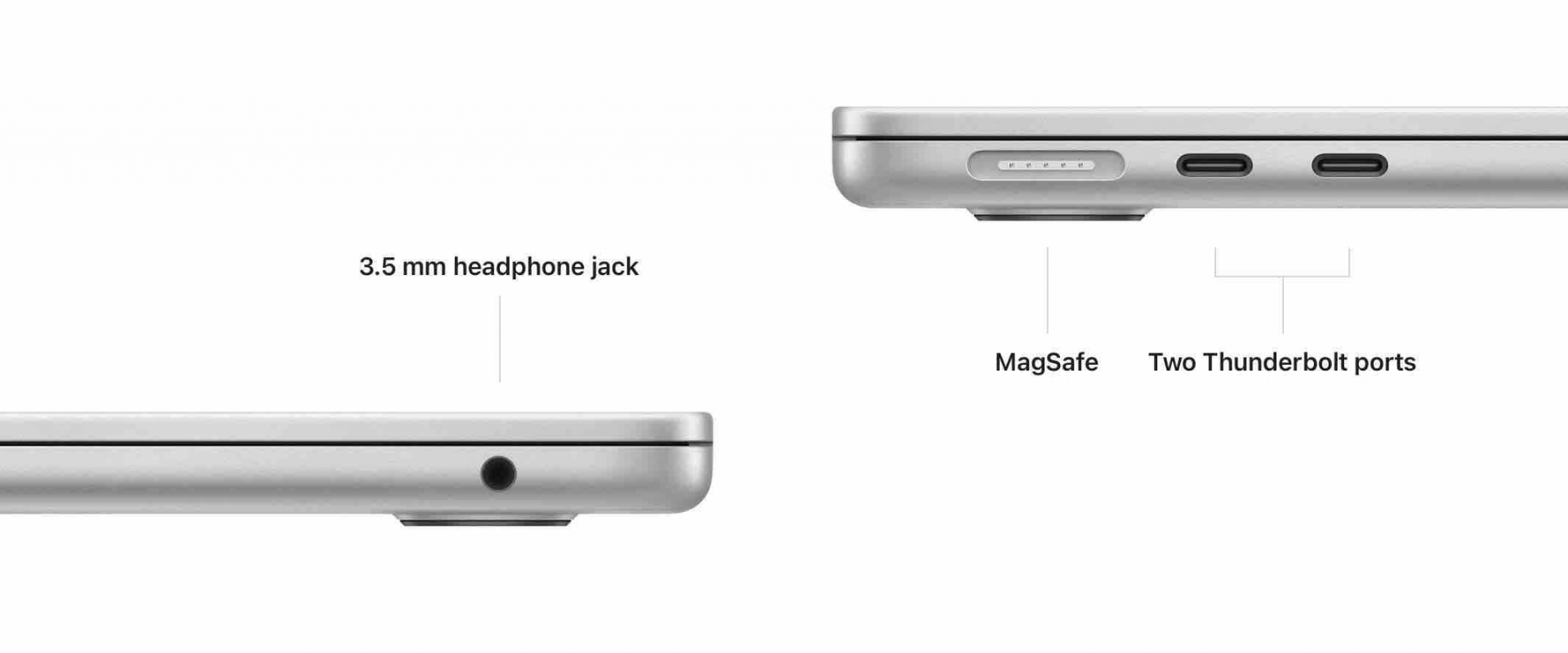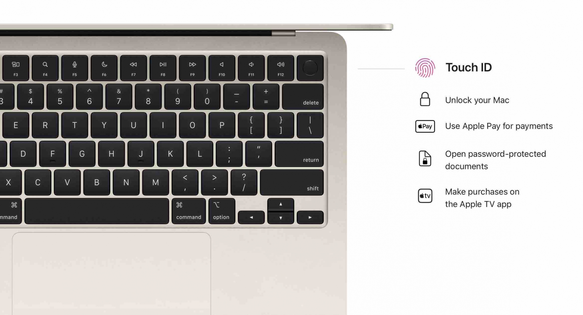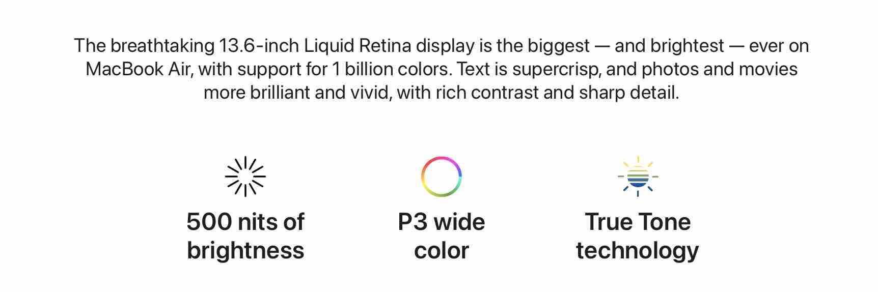 Ngoài ra, laptop của Apple có hệ thống bốn loa ngoài, cảm biến vân tay một chạm và bàn phím có các nút chức năng kích thước tiêu chuẩn.Màn hình kích thước 13,6 inch, lớn hơn một chút so với bản cũ với độ phân giải Retina, độ sáng tối đa 500 nit. Phía trên là "tai thỏ" chứa webcam Full HD có độ phân giải và độ nhạy sáng cao gấp đôi model cũ. Apple cho biết máy không cần hệ thống quạt để tản nhiệt khi sử dụng.