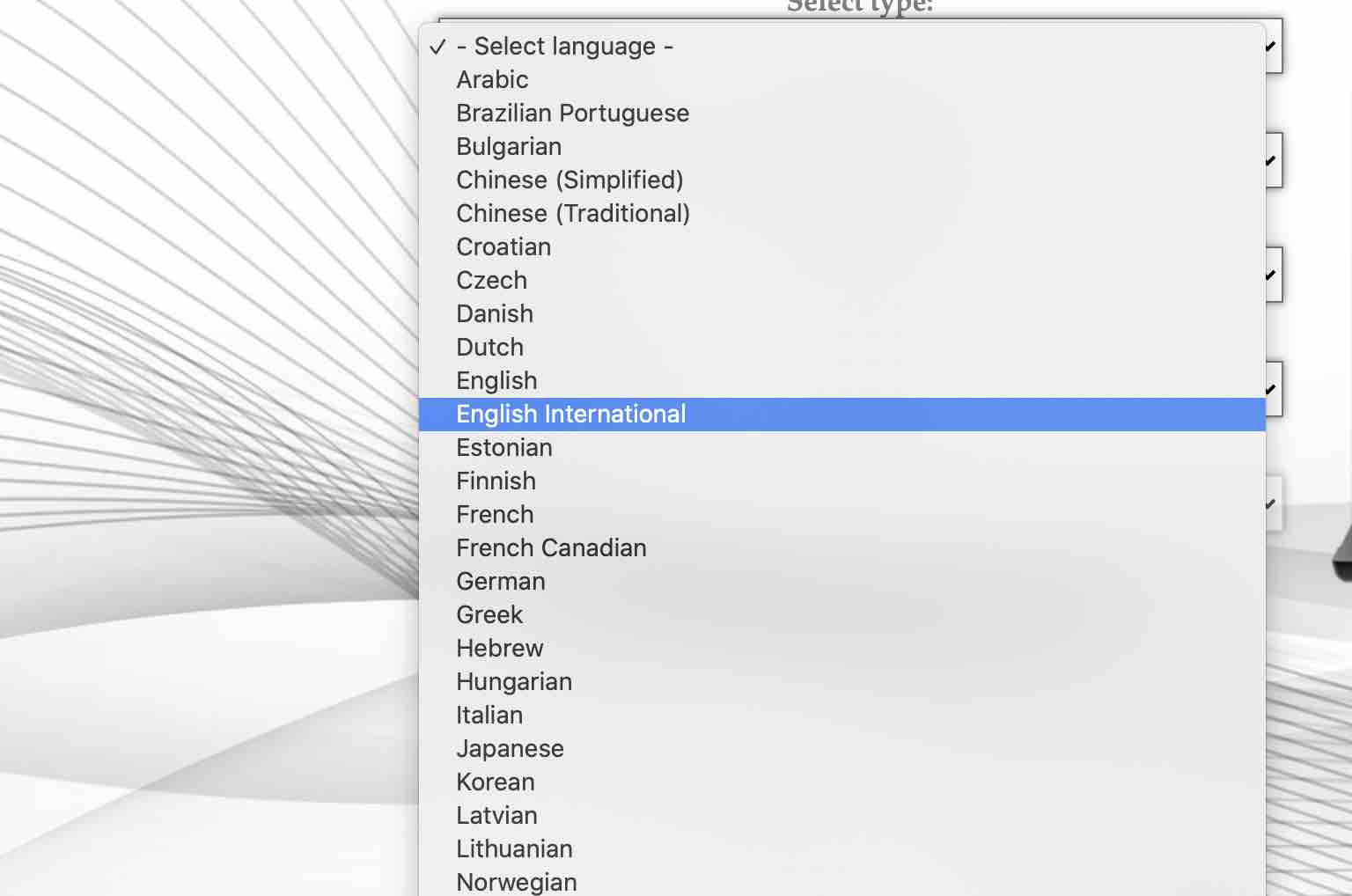 Hàng tiếp theo là chọn ngôn ngữ , chủ yếu là chọn ngôn ngữ tiếng anh , international