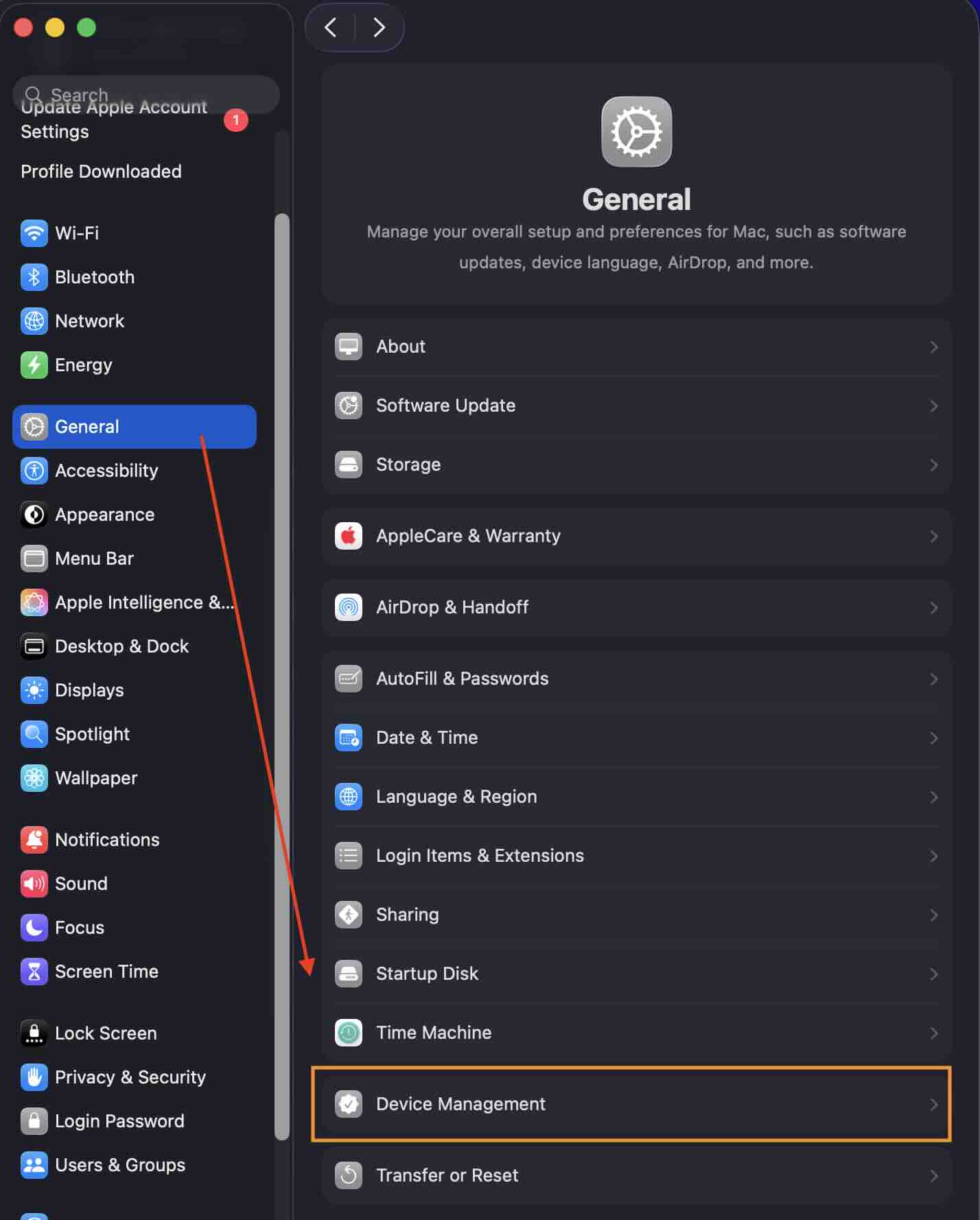 Bấm OK sau đó vào cài đặt Chung >>> Kéo xuống chút vào phần quản lý thiết bị Device Management